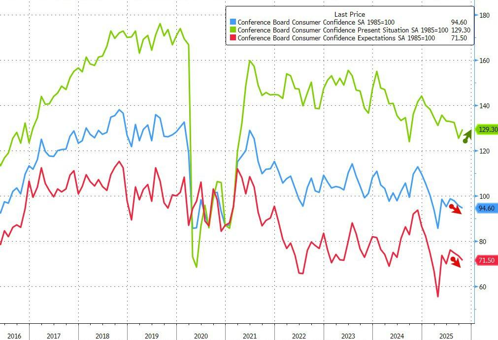 整体来看,消费者信心仍低于去年水平,反映出人们对劳动力市场和生活成本的担忧。就业增长明显放缓,通胀仍高于美联储目标,而特朗普的关税政策继续加剧经济不确定性。
